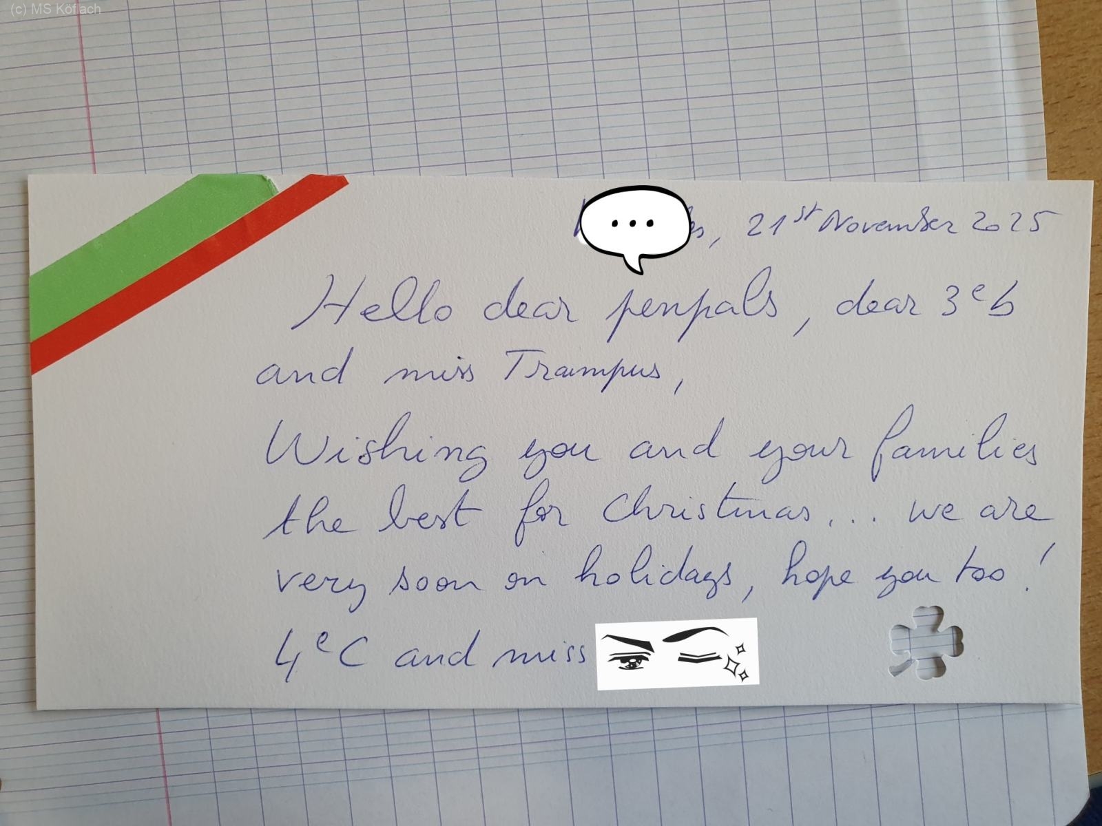 Als Europaschule liegt es uns am Herzen unseren Kindern verschiedene Kulturen, Länder und Sprachen näherzubringen, und internationale Beziehungen zu knüpfen! Daher freuen wir uns sehr, dass sich in den letzten Wochen eine tolle Brieffreundschaft mit unserer Partnerschule in Frankreich entwickelt hat! Zur Adventzeit hat die 3b sogar einen selbstgebastelten Adventkalender aus Frankreich erhalten!